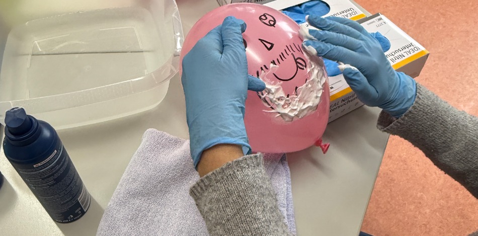 Um die Bedeutung einer korrekten Händedesinfektion zu verdeutlichen, konnten die Teilnehmer*innen ihre eigene Durchführung unter UV‑Licht überprüfen. Dabei wurde sichtbar, wie schnell kleine Fehler passieren – und warum Hygiene zu den zentralen Grundlagen professioneller Pflege gehört.